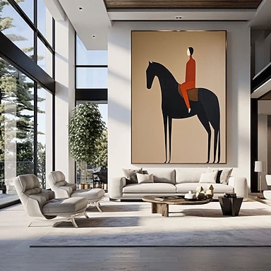 Tableau minimaliste japonais fait main représentant un cheval western, grand cheval noir texturé sur toile, décoration neutre originale pour salon.
