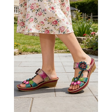 Sandales compensées fleuries en cuir véritable violet pour femme | Sandales souples et confortables à bout ouvert, idéales pour la marche, les garden-parties et le quotidien.
