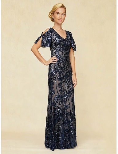 Femmes Robe maxi Robe fourreau Élégant Soirée Paillettes Dentelle Évider Coupe régulière Fleuri Demi Manches Col ras du cou bleu marine