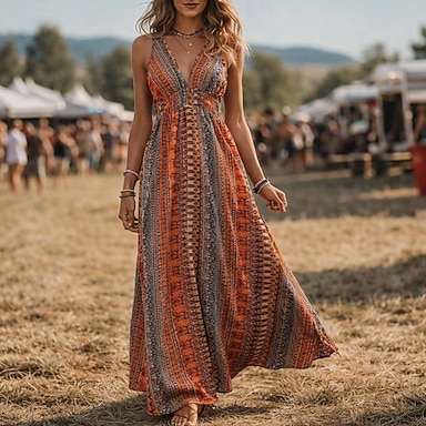 Bohème Rétro Vintage Boho Longue longueur Robe Sans manches Bohème Col en V Déguisement Femmes Mascarade Festival de Musique Soirée à thème rétro Adulte Robe Été