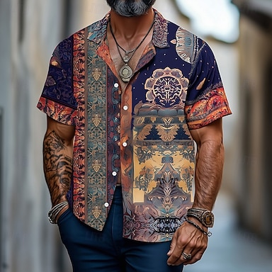 Homme Vintage Indien Bohème Chemise Chemise hawaïenne Chemise Boutonnée Manche Courte Hawaïen Vacances Fête Tenue de plage Été Printemps Col Rabattu Impression 3D chemises à col Bleu de minuit