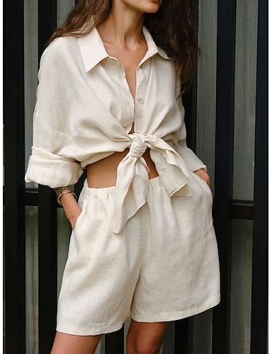 Femmes Ensembles en coton et lin 100% Coton manche longue Col de chemise Couleur Unie Actif Basique Décontracté Quotidien Noir Blanche Jaune Été Coupe régulière