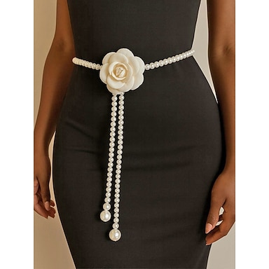 Collier de taille camélia pour femme, chaîne en fausses perles, noir et blanc, bijou élégant et polyvalent pour mariage, soirée, bureau et occasions formelles.