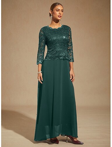 Femmes Robe maxi Robe en Chiffon Élégant Soirée robe demoiselle d honneur Paillettes Dentelle Coupe régulière Couleur Unie Manche 3/4 Col ras du cou Vert Emeraude