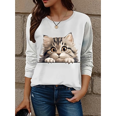 T-shirt femme col rond à manches longues tunique chat moderne décontracté tops réguliers impression quotidienne week-end blanc jaune rouge bleu bleu poussiéreux automne hiver