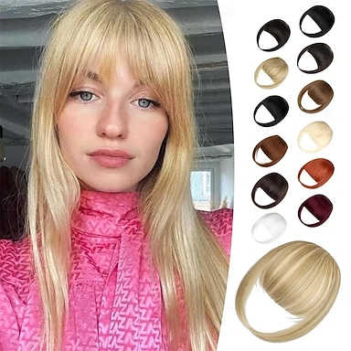 Frange à clip, frange naturelle à clipser, frange française blond clair décoloré avec mèches sur les tempes, extensions de frange pour femme, à porter au quotidien.