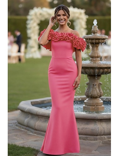 Sirène Trompette Longueur au sol Robes de Bal Robe de Soirée Tenue de soirée Élégant Manche Courte Épaules Dénudées Formel Crêpe Extensible avec Froncé Volants