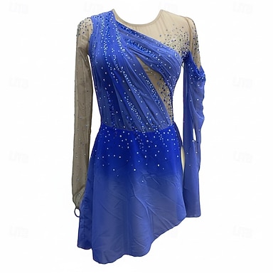 Robe de patinage artistique Femmes Patinage Robe Bleu Ciel Patchwork Ourlet asymétrique Haute Élasticité Entraînement Compétition Tenue de Patinage Classique cristal pailleté manche longue Patinage