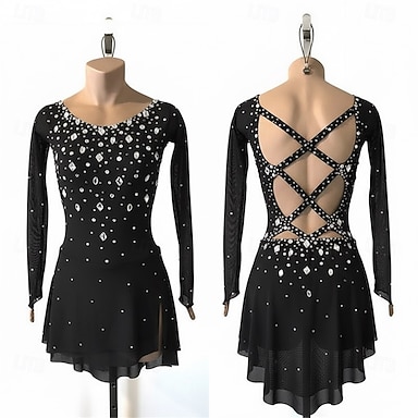Robe de patinage artistique Femmes Patinage Robe Noir Patchwork Dos Nu Haute Élasticité Entraînement Compétition Tenue de Patinage Classique cristal pailleté manche longue Patinage sur glace Patinage