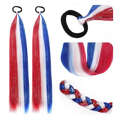 Extension queue de cheval rouge, blanche et bleue avec élastique, extensions de cheveux colorées, accessoires pour coiffures extravagantes de festival, queue de cheval scintillante de 63,5 cm (25