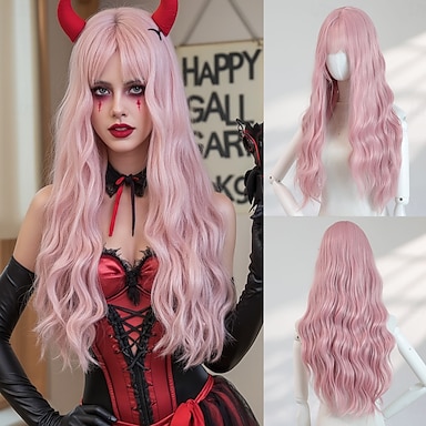 Perruque longue ondulée rose de 26 pouces avec frange – cheveux synthétiques pour déguisement d'Halloween, parfaits pour le cosplay et les séances photo & mode