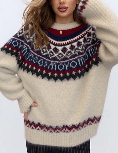 Femmes Pull de Noël Pull Fair Isle Pull Pull Fair Isle Mode Occasionnel Géométrique Côtelé Col ras du cou Tricoté Imprimé manche longue Hauts Réguliers Tricoter Noël Extérieur Quotidien Beige Automne
