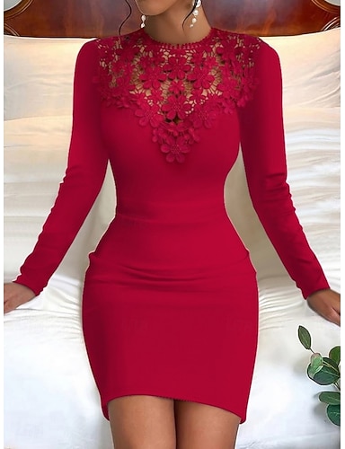 Femmes Mini Robe Robe fourreau Fête cocktail Robes semi-formelles Extérieur Soirée Cocktail Coupe régulière Couleur Unie manche longue Col ras du cou Rouge Été Printemps Automne