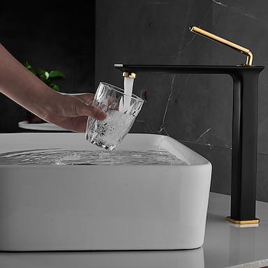 robinet mitigeur lavabo cascade haut court, lavabo monocommande mitigeur lavabo, salle d'eau avec flexible eau chaude et froide vasque monobloc eau robinet en laiton monté sur pont noir doré