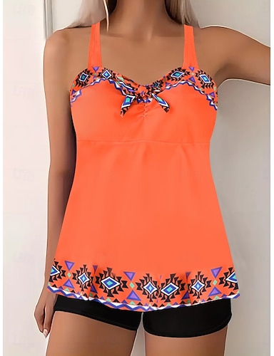 Maillot de bain tankini 2 pièces femme boho short taille haute contrôle du ventre slim dos nu vacances plage motifs géométriques col en V sans manches