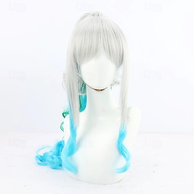 Perruque argentée d'aventurière des océans avec des pointes dégradées bleues et vertes pour une soirée cosplay
