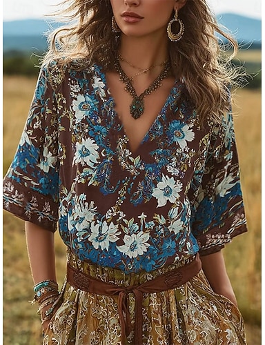 Femmes Chemise Chemise Bohème Faux coton lin Boutons Imprimé Fleuri Graphique Bohème Actif ancien manche longue Col de chemise Hauts Réguliers Quotidien Fête Vert Printemps Automne