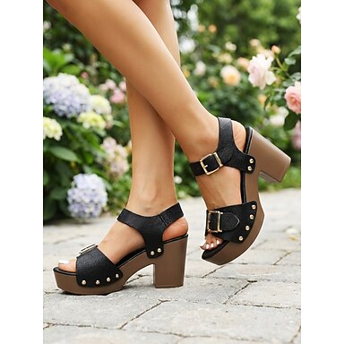 Sandales noires à talon compensé et boucle pour femmes – chaussures à plateforme confortables et à bout ouvert, parfaites pour une tenue décontractée, une garden-party ou le quotidien.