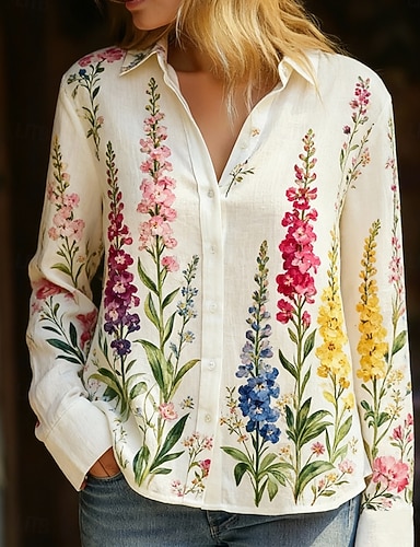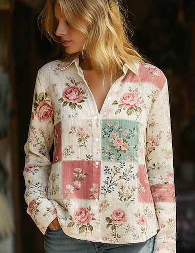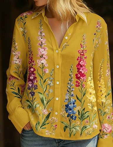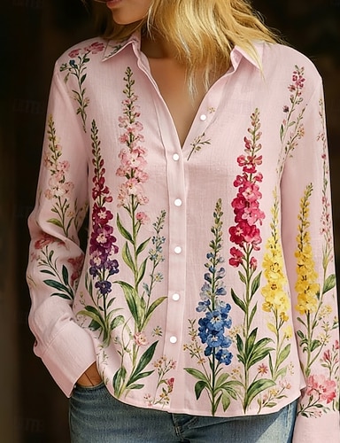 Chemisier Femme Lin Comme Respirant Léger Chemise Tunique Boutonnée Col Manches Longues Floral Décontractée Hauts Normaux Travail Quotidien Imprimé Rose Rouge Bleu Vert Printemps Automne Hiver