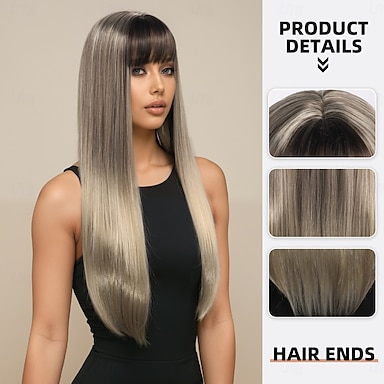 Perruque synthétique 26 pouces pour femmes, perruque dégradé de couleur avec cheveux longs et lisses marron avec frange, mode cosplay de fête quotidienne