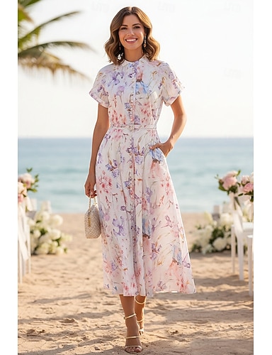 Ligne A Longueur cheville Longueur thé Robe d'invité de mariage Robes pour invités de mariage Élégant Quotidien Manche Courte Col haut Fête de jardin Mariage Dos Bénitier avec Imprimé floral Imprimé