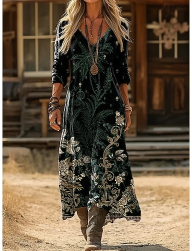 Femmes Robe maxi Robe d'Été Robe d'été Vacances Occasionnel Boho Quotidien Plage Sortir Coupe régulière Fleuri Graphique Bloc de Couleur manche longue Col en V Bleu Noir Violet Été Printemps