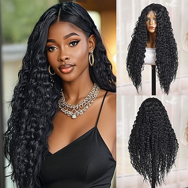 Perruque en dentelle synthétique Boucles profondes Style 28 pouce Noir Raie au milieu partie U Perruque Femmes Perruque Noir