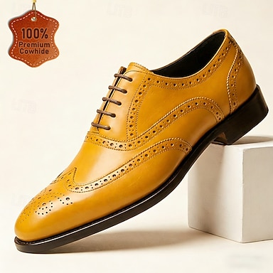 Chaussures Oxford à bout golf jaune moutarde pour homme, ornées de perforations, chaussures habillées vintage classiques, idéales pour les mariages, les réunions d'affaires, les fêtes et les occasions formelles.