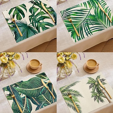 Set de table rectangulaire en tissu à motif de feuilles de palmier, 100 % polyester tissé, motif de plantes tropicales vertes, lavable en machine, résistant à la chaleur, protection de table durable,