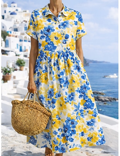 Femmes Robe Midi Faux coton lin Robe fourreau Robe Décontractée Robe d'été Mode Moderne Quotidien Plage Week-end Coupe régulière Fleuri Manche Courte Col ras du cou Bleu Blanche Jaune Rouge Été