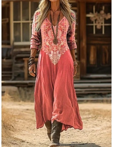 Robe longue femme Robe maxi Robe bohème Robe décontractée Robe trapèze Robe d'été Vintage Vacances Quotidien Plage Coupe classique Floral Manches 3/4 Col V Rouge Été Printemps Automne