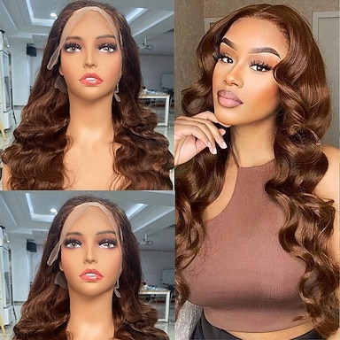 Perruque Cheveux Naturel Rémy dentelle frontale 13x4 Cheveux Birmans Ondulation naturelle Marron Marron Clair Raie sur le côté Femmes Densité 150% we say baby hair Sans Colle Pré-pincé Long Moyen brun