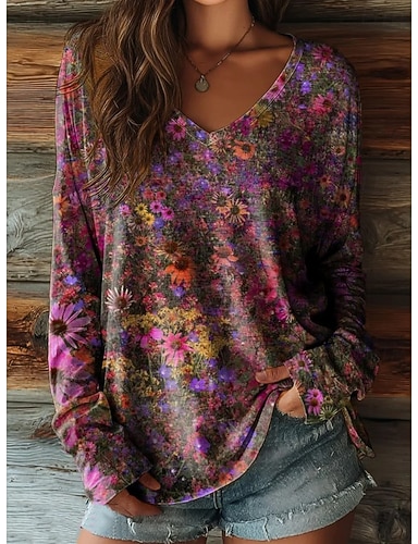 Femmes T-shirt Imprimé Fleuri Graphique Tournesol ancien Occasionnel Boho manche longue Col en V Hauts Réguliers Quotidien Bleu Vert foncé Violet Orange Gris anthracite Été Printemps Automne