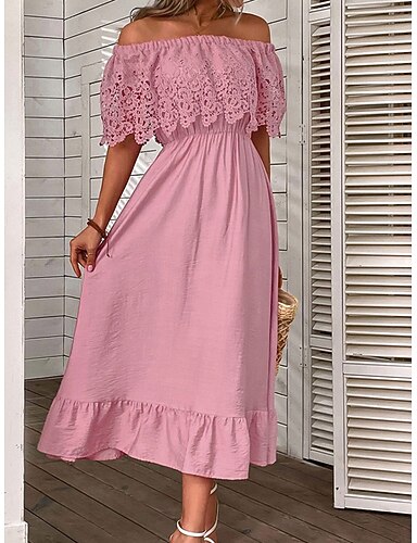 Femmes Robe Midi Faux coton lin Robe d'Été Robe Décontractée Robe évasée Basique Occasionnel Quotidien Vacances Date Coupe régulière Uni Demi Manches Épaules Dénudées Noir Rose Claire Vert Ét
