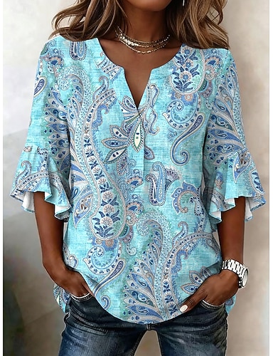 Femmes Chemisier A Volants Imprimé Graphique Paisley Vacances ancien Quotidien Manche 3/4 Col en V Hauts Réguliers Occasionnel Quotidien Fête Bleu Jaune Rose Claire Violet Été Printemps