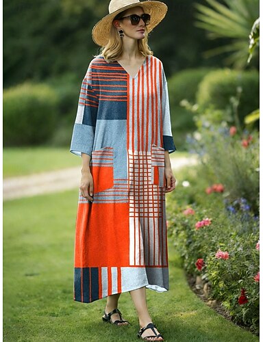 Robe maxi femme en lin léger respirant robe d'été décontractée A-line bohémienne plage coupe loose graphique géométrique manches 3/4 encolure en V bleu rose rouge orange été printemps