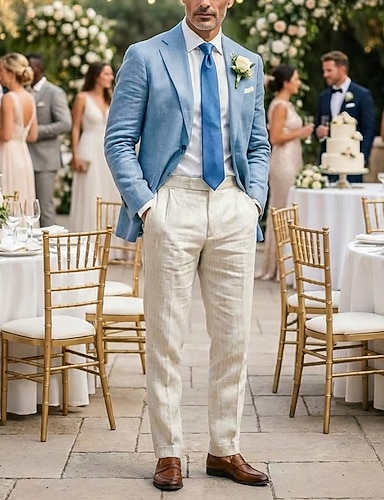 Pour des hommes Costumes en lin Mariage à la plage Blanche Bleu Ciel Printemps & Été Costume / Tailleur Revers Cranté Formel Couleur Unie Coupe Slim 2 pièces Simple Boutonnage Deux Boutons