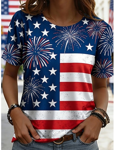 Jour de l'Indépendance Américaine Femmes T-shirt Imprimé Graphique Drapeau Élégant Classique Occasionnel Manche Courte Col ras du cou Hauts Réguliers Quotidien Sortir Week-end Bleu Bleu Roi Ét
