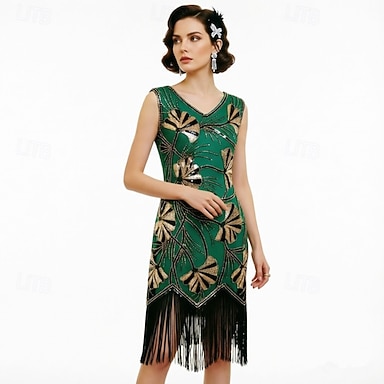 Années Folles Années 1920 Mi-long Robe Charleston Tenues Serre Tête Flapper Sans manches Gatsby le Magnifique Invité au mariage Paillettes Frange à pompons Col en V Déguisement Femmes Noël Carnaval