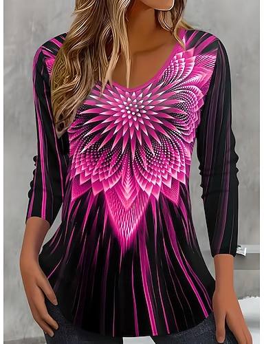 T-shirt femme à col V manches longues tunique ombre floral géométrique élégant vintage tops réguliers impression quotidienne rose orange gris clair été printemps