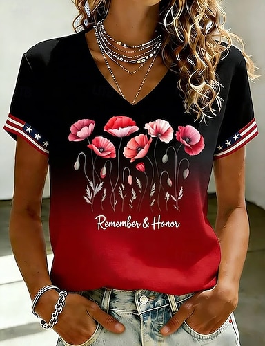 Jour de l'Indépendance Américaine Femmes T-shirt Imprimé Graphique Drapeau Américain Élégant Classique Occasionnel Manche Courte Col en V Hauts Réguliers Quotidien Week-end Tenue de plage Bleu Noir