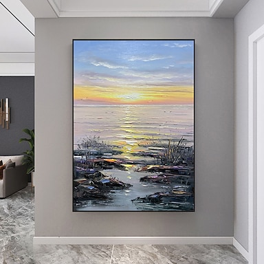 Peinture à l'huile faite à la main sur toile, décoration murale, impression contemporaine, lever de soleil doré sur le paysage de la mer, pour la décoration intérieure, peinture roulée sans cadre, non