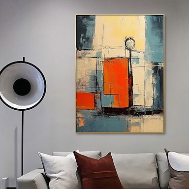 Peinture minimaliste faite main, peinture à l'huile aux couleurs mélangées, collage de blocs fait main, peinture de cuisine, art abstrait géométrique moderne, jaune orange vert bleu noir, affiche,