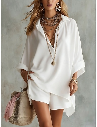 Femmes Ensembles de Shorts Faux coton lin Manche 3/4 Col en V Couleur Unie Mode Streetwear Occasionnel Quotidien Extérieur Bleu Noir Blanche Été Coupe régulière