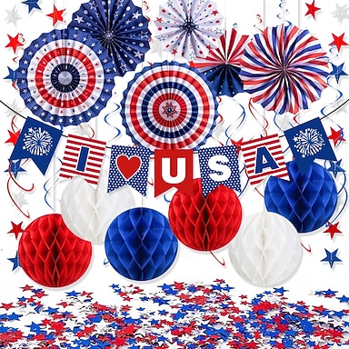 27 décorations rouges, blanches et bleues pour le 4 juillet aux États-Unis : éventails en papier, pompons et guirlandes suspendues pour une fête patriotique, célébrant l’indépendance, les vétérans,