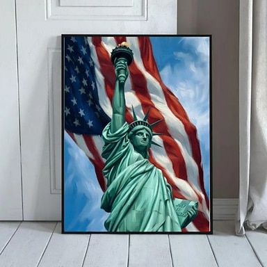 Amérique 250 ans, peinture à l'huile artisanale sur toile, décoration murale représentant étoiles, rayures et la Statue de la Liberté. Toile roulée, sans cadre et non tendue.