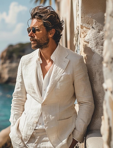 Homme Veste blazer Mariage Anniversaire Soirée Été Printemps 100% Lin Lin Couleur Unie Droit 1 bouton veste bleu marine Bleu Beige