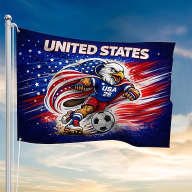Drapeau des États-Unis - mascotte aigle dynamique sur maillot USA 26 donnant un coup de pied dans un ballon de football, fond étoilé, couleurs vives &durable