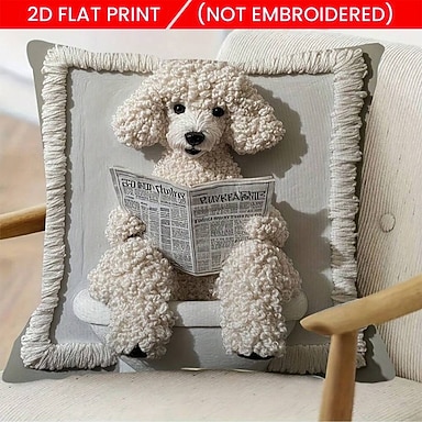 Housse de coussin décorative en peluche douce et courte, imprimée en 2D avec un motif de chien lisant, ornée d'une fausse broderie. Idéale pour canapé, chambre, salon et décoration intérieure. Garniture non incluse.