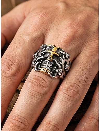 Bague homme en acier inoxydable à motif crâne gothique, bague biker punk multi-tailles ornée de fleurs, bijou tendance et audacieux pour un look décontracté, les voyages, les vacances et Halloween.